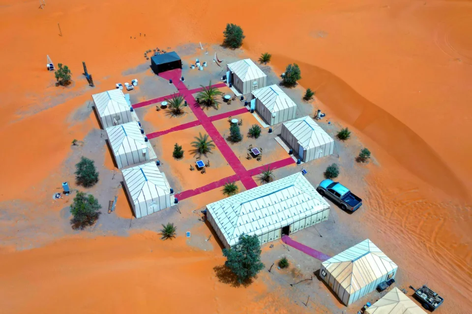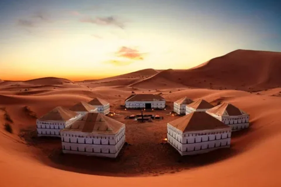 The highlight of the day is Merzouga. Here, we leave our vehicle to mount a dromedary camel, the true desert all-terrain vehicle, and ride across the magnificent Erg Chebbi dunes. This experience offers an intimate encounter with the golden sands of the Sahara, guided by the rhythm of the desert itself. Upon reaching the luxury Berber-style camp, guests are welcomed with traditional tea and Moroccan hospitality, enjoying dinner under a star-filled sky and the serene silence unique to the desert night.