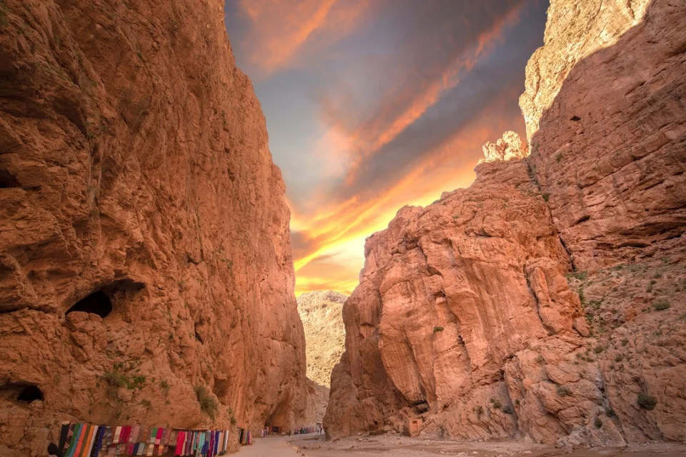 After breakfast, the journey continues through impressive desert landscapes. Passing Tinghir, surrounded by lush palm groves, you arrive at the breathtaking Todra Gorges, a narrow canyon with vertical limestone cliffs rising over 300 meters, ideal for walking and photography.