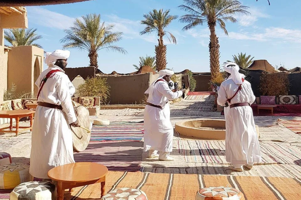 Stop at KHAMLIA, famous for GNAWA MUSIC, a heritage from their ancestors. Continue on former PARIS-DAKAR TRACKS, passing old KOHL MINES and FRENCH PROTECTORATE-ERA VILLAGES. The day includes visits to SEMI-NOMADIC FAMILIES, offering insight into their TRADITIONAL LIFESTYLE. Dinner and overnight stay will be at a DESERT INTEGRATED HOTEL.