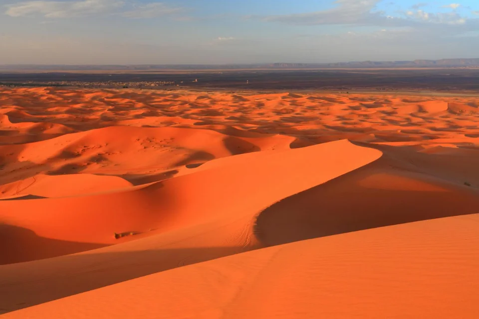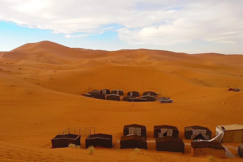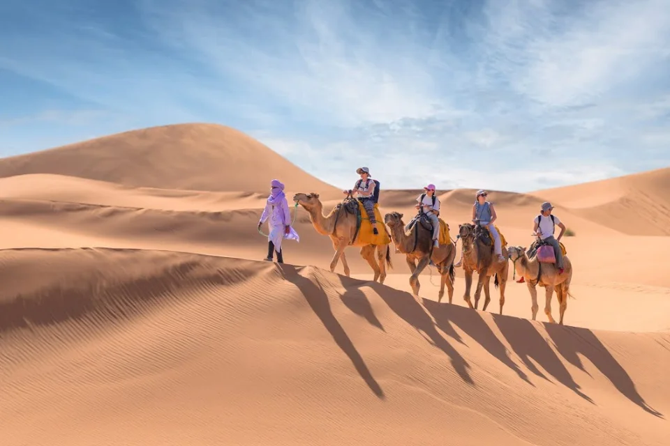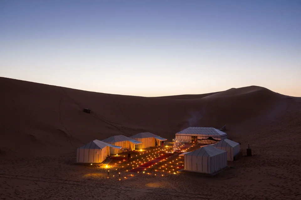 Continuing through PALM GROVES, KASBAHS, and VILLAGES, we reach ERFOUD, known for its FOSSILS dating back to the DINOSAUR ERA. Finally, in MERZOUGA, we switch to CAMELS to cross the ERG CHEBBI DUNES. Dinner and overnight stay will be in a LUXURY DESERT TENTED CAMP under the STARRY SKY.